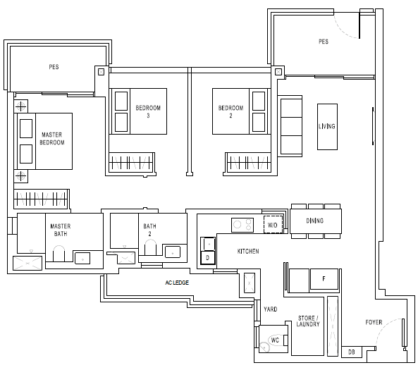 | 2 Bedroom (D) | 958 - 1163 | 94 |